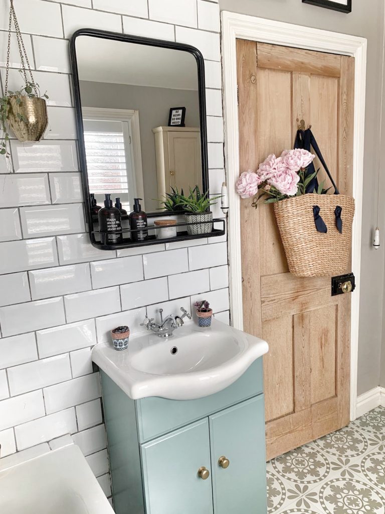 Obviously, painting the walls is an easy thing to do to give your room a fresh new look. Also consider painting the cupboards, bath panels and vanity unit in a colour too. You can use internal wood paint for this or paint such as Frenchic Alfresco paint. I used Farrow and Ball Oval Room Blue in our bathroom as I wanted a soft rich blue to inject some personality into our bathroom. Before installing our metro tiles, we also painted the old wall tiles with Ronseal tile paint which refreshed the room for about £20.