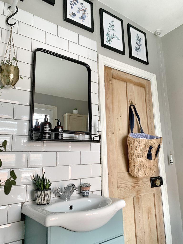 People often forget to dress their bathroom, this can be a relatively cheap way to update your bathroom. I bought a new mirror with a shelf to give a modern, industrial look and then covered the bathroom in Junique prints (gifted to me) which instantly dressed the room.