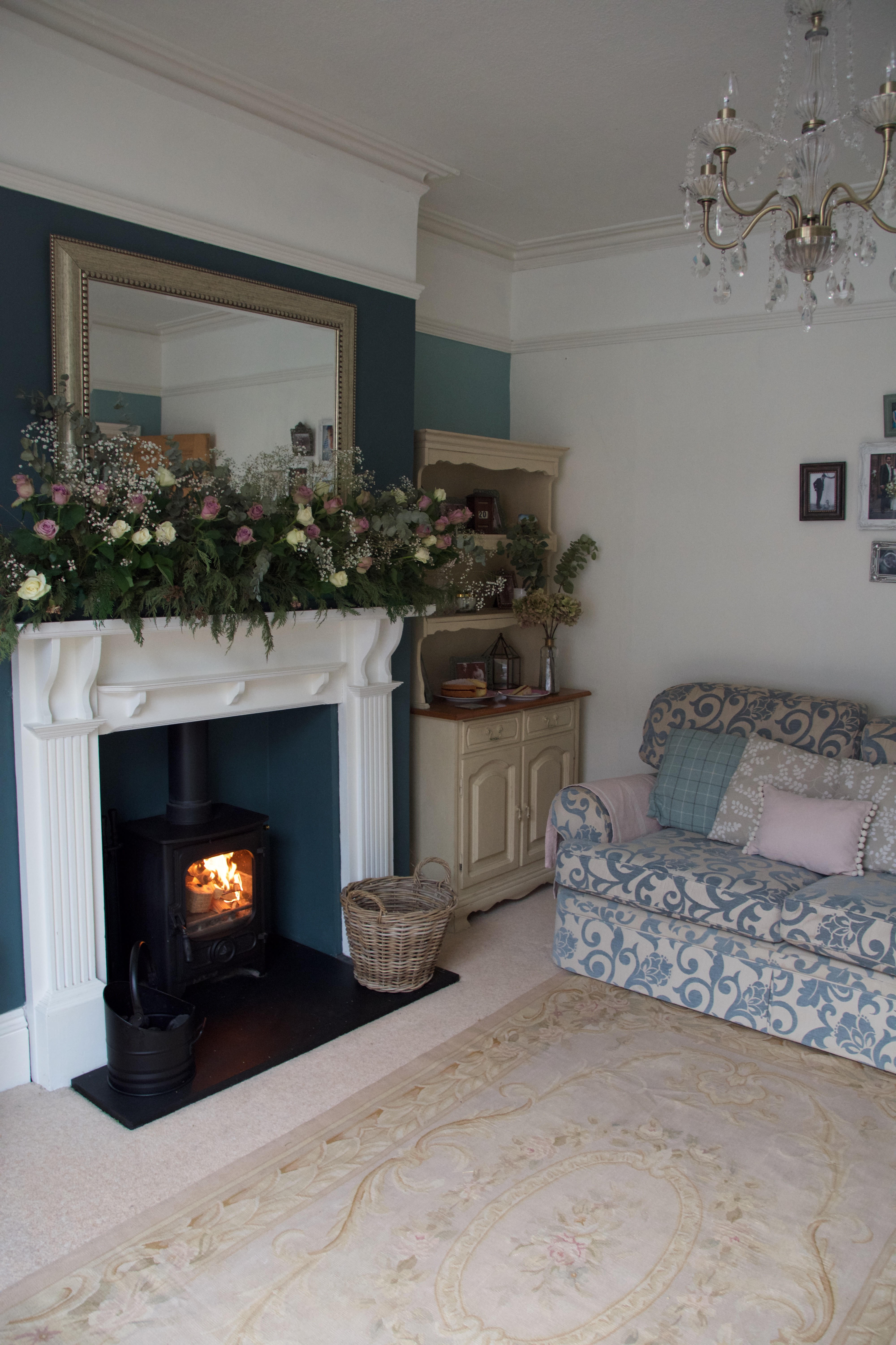 To help create ‘The Crown’ look continue the floral look with floral cushions and lots of fresh flowers in the room.  In our living room, I have included a floral garland which I made in a base of oasis.  It helps to create a grand royal look!